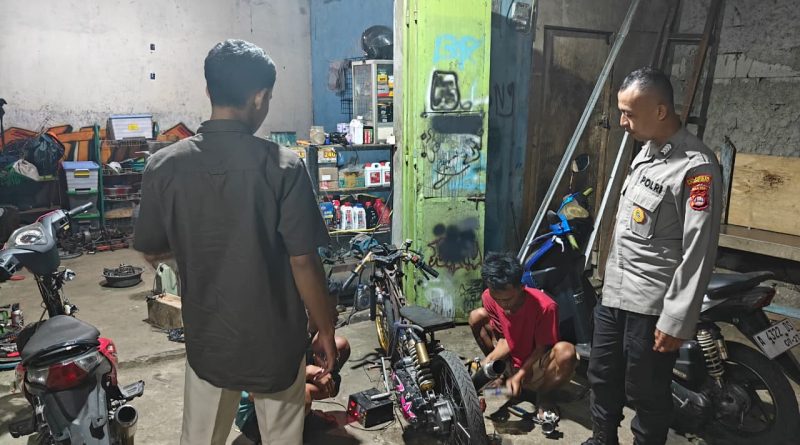 POLRESTA SERKOT_ Anggota Polsek Baros Polresta Serkot Polda Banten Bripka Robin melaksanakan kegiatan patroli malam dengan sambang bersama masyarakat di Bengkel Sepeda Motor di wilkum Polsek Baros Polresta Serkot, Minggu (19/04/2026).