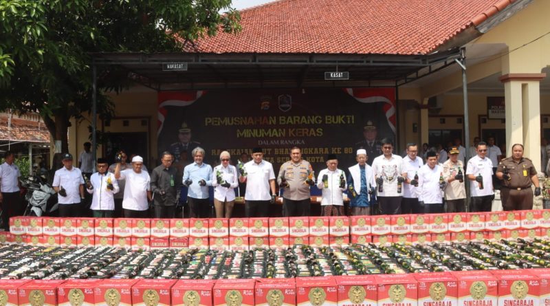 POLRESTA SERKOT_  Dalam rangka memperingati Hari Bhayangkara ke-80, Polresta Serang Kota melaksanakan kegiatan pemusnahan barang bukti berupa ribuan minuman keras (miras). Kegiatan tersebut dipimpin langsung oleh Kapolresta Serang Kota, Yudha Satria, S.H., S.I.K., M.H., bertempat di depan Gedung Satreskrim Polresta Serang Kota pada Rabu, 29/04/26.